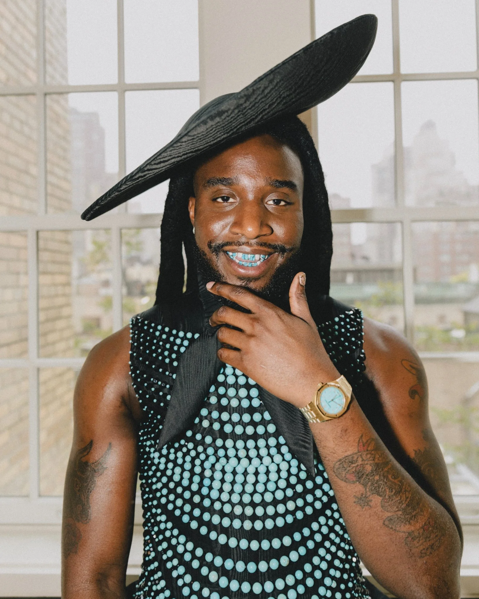 Shaboozey : associe ses Grillz en pierres de turquoises à sa tenue