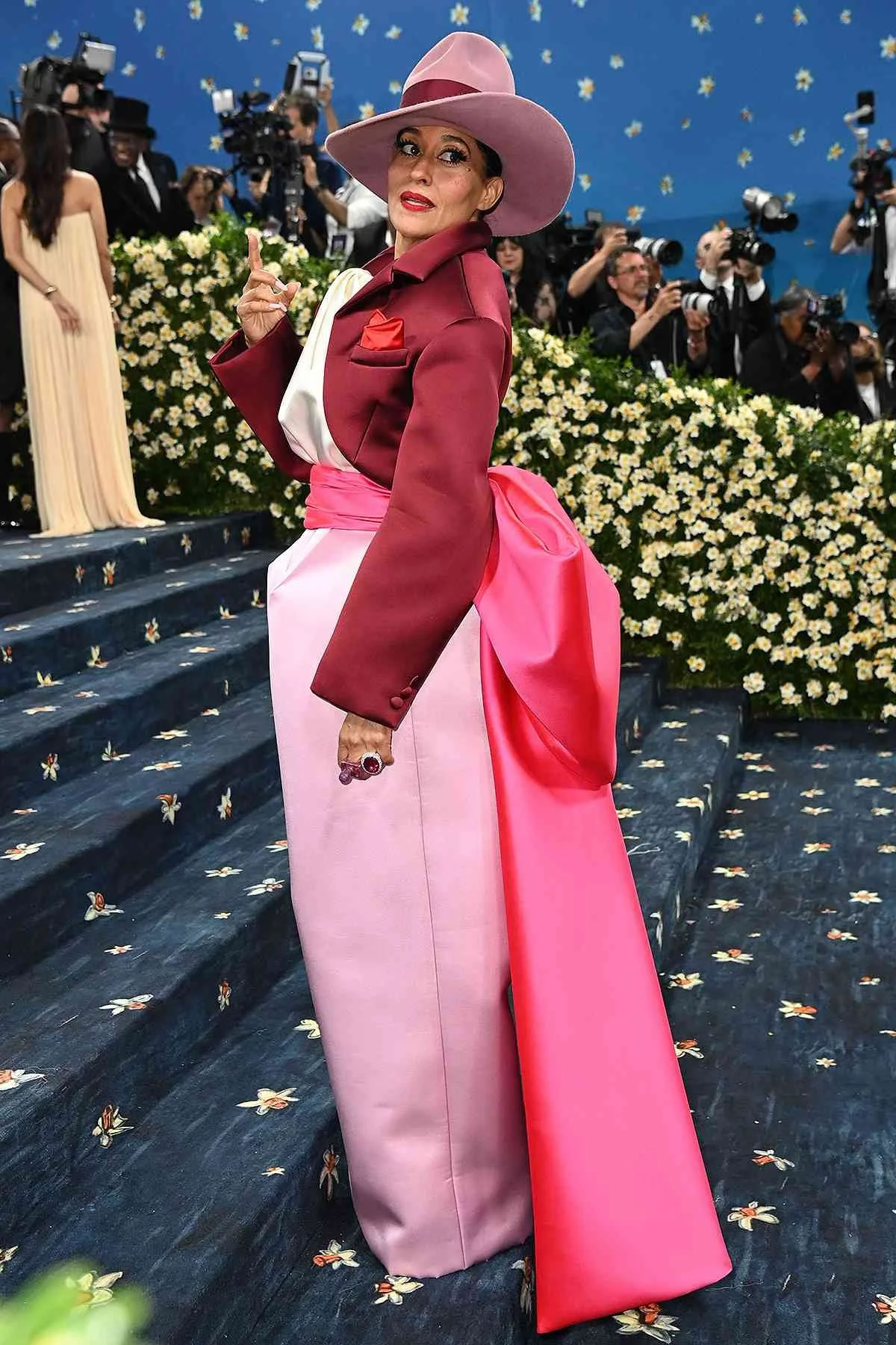 Tracee Ellis Ross : color-block maîtrisé et tailoring dramatique, sublimé par une jupe en satin nouée.